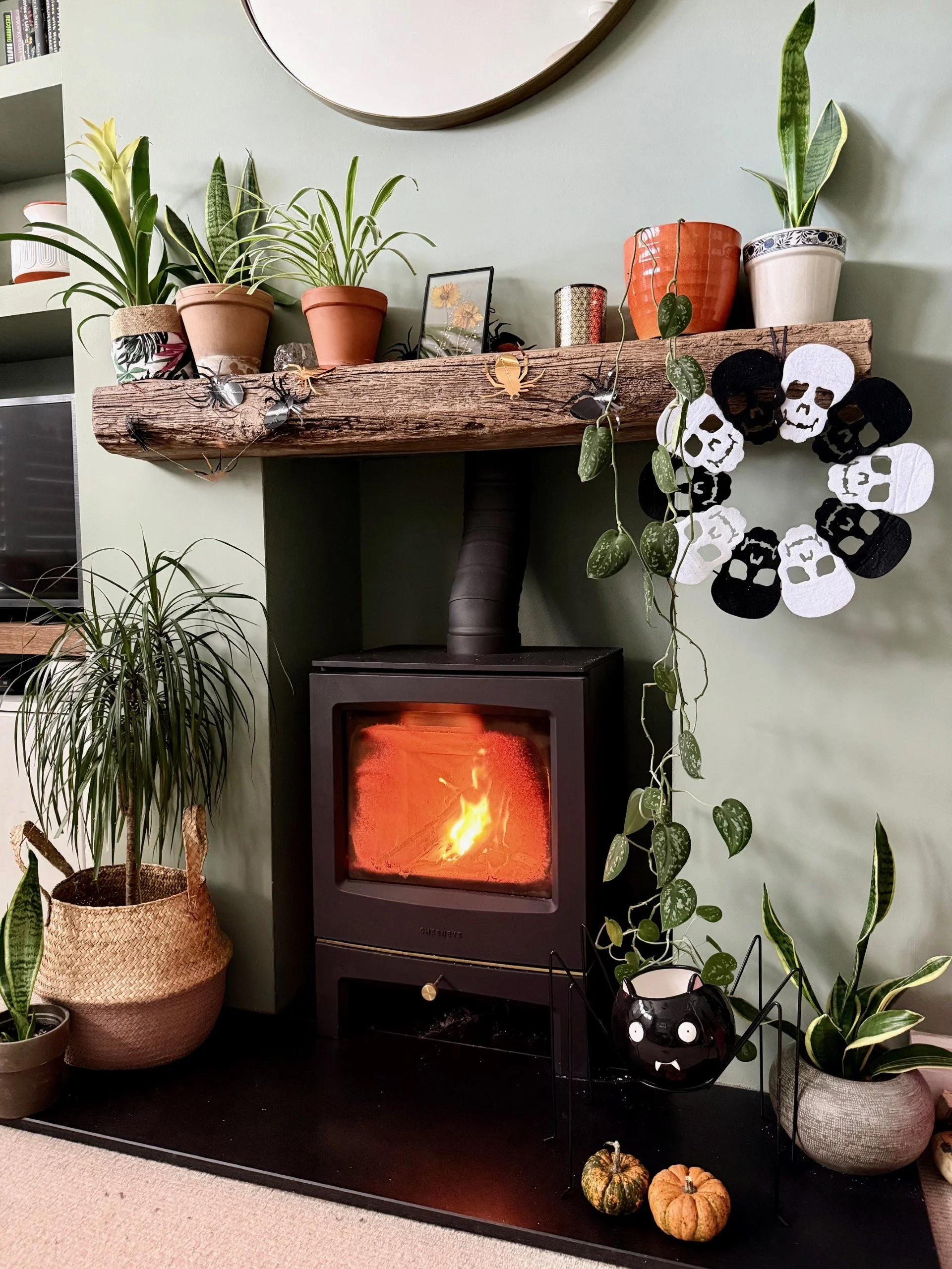 A cosy green living room welcomes soft northern light, with a fire that fills the space with warmth and calm.